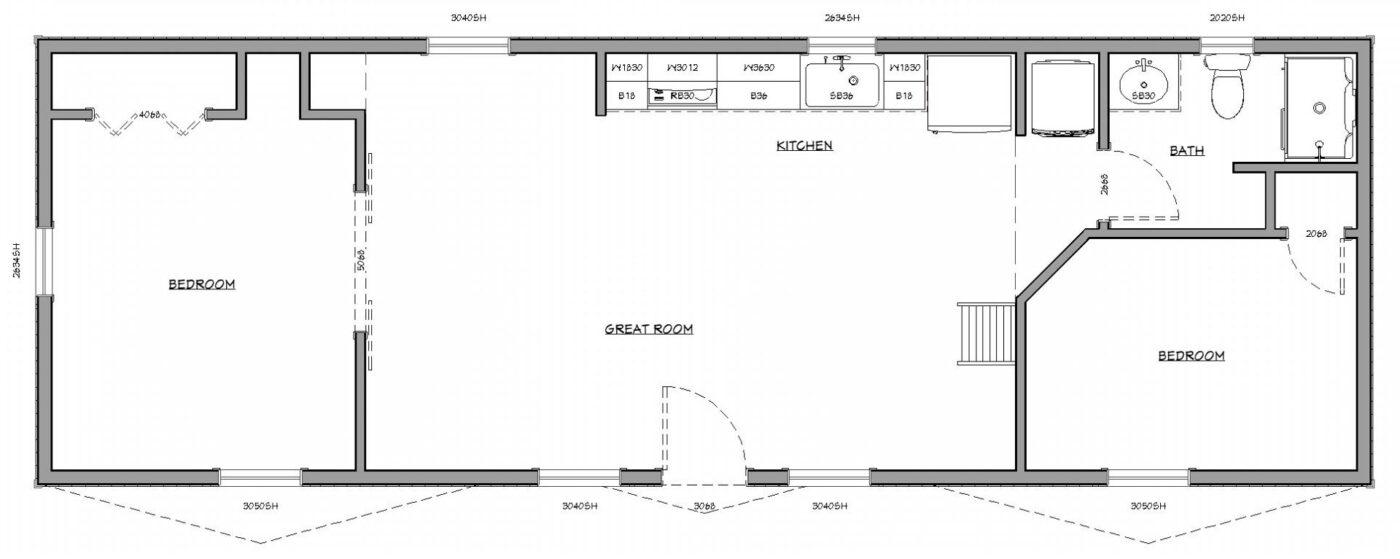 The G130 prefab cabin features two bedrooms positioned at opposite ends, with a spacious great room at the center. This inviting space includes a kitchen, bathroom, and washer/dryer hookups. A staircase with built-in storage leads up to the loft, maximizing functionality. Inside, the cabin is beautifully finished with tongue-and-groove pine walls and exposed ceiling beams.