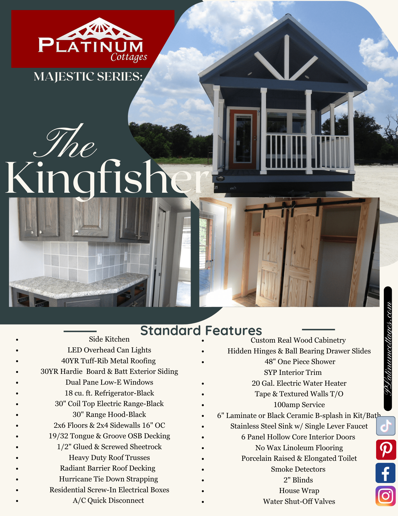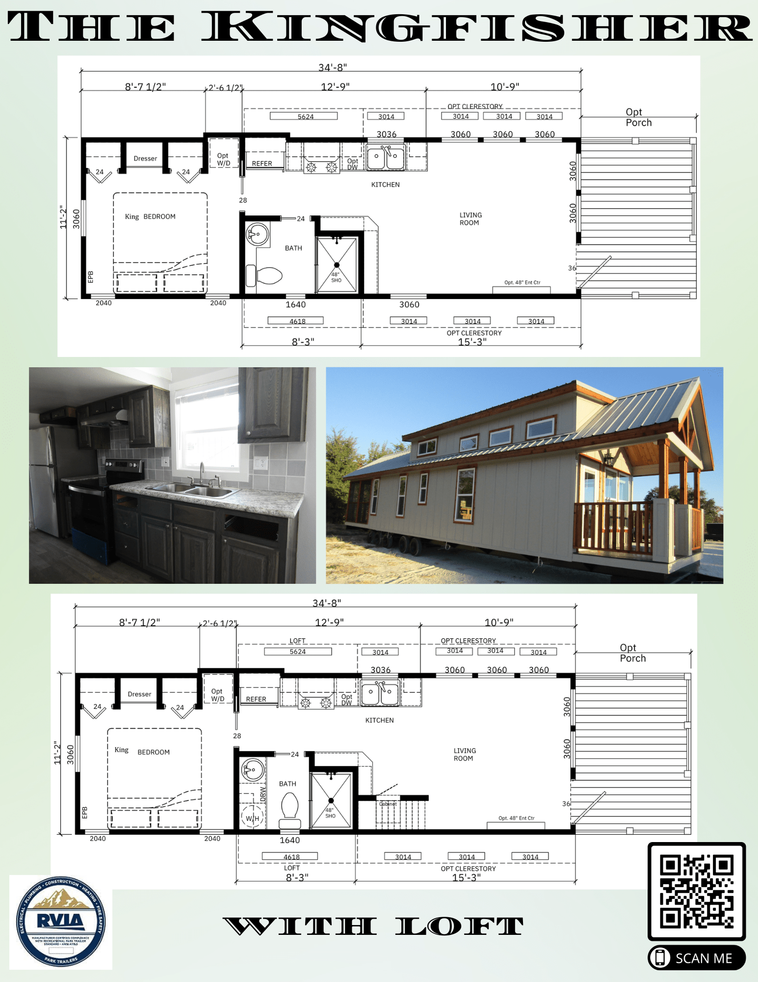 The Kingfisher Park Model Tiny Home from Utah Structures is a perfect blend of durability, efficiency, and modern design. Built to last, this high-quality tiny home features 40-year Tuff-Rib metal roofing, 30-year Hardie Board & Batt siding, and heavy-duty roof trusses for exceptional strength and longevity. Inside, the side kitchen layout offers a functional and stylish space equipped with black appliances, including an 18 cu. ft. refrigerator, a 30″ coil top electric range, and a matching range hood. Energy efficiency is a priority, with dual-pane Low-E windows, LED overhead can lights, and a radiant barrier roof decking to enhance insulation. Constructed with 2×6 floors, 2×4 sidewalls at 16” OC, glued and screwed sheetrock, and hurricane tie-down strapping, the Kingfisher is built for stability and comfort. Whether you’re looking for a cozy getaway or a full-time residence, this park model tiny home offers a smart, stylish, and durable living solution.