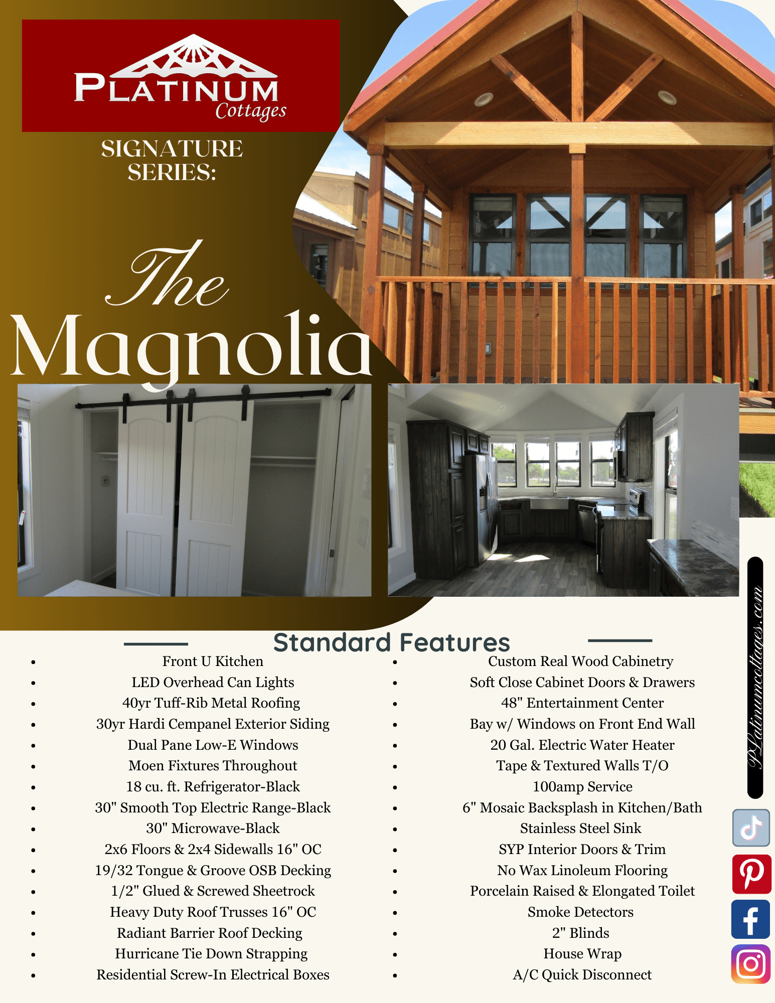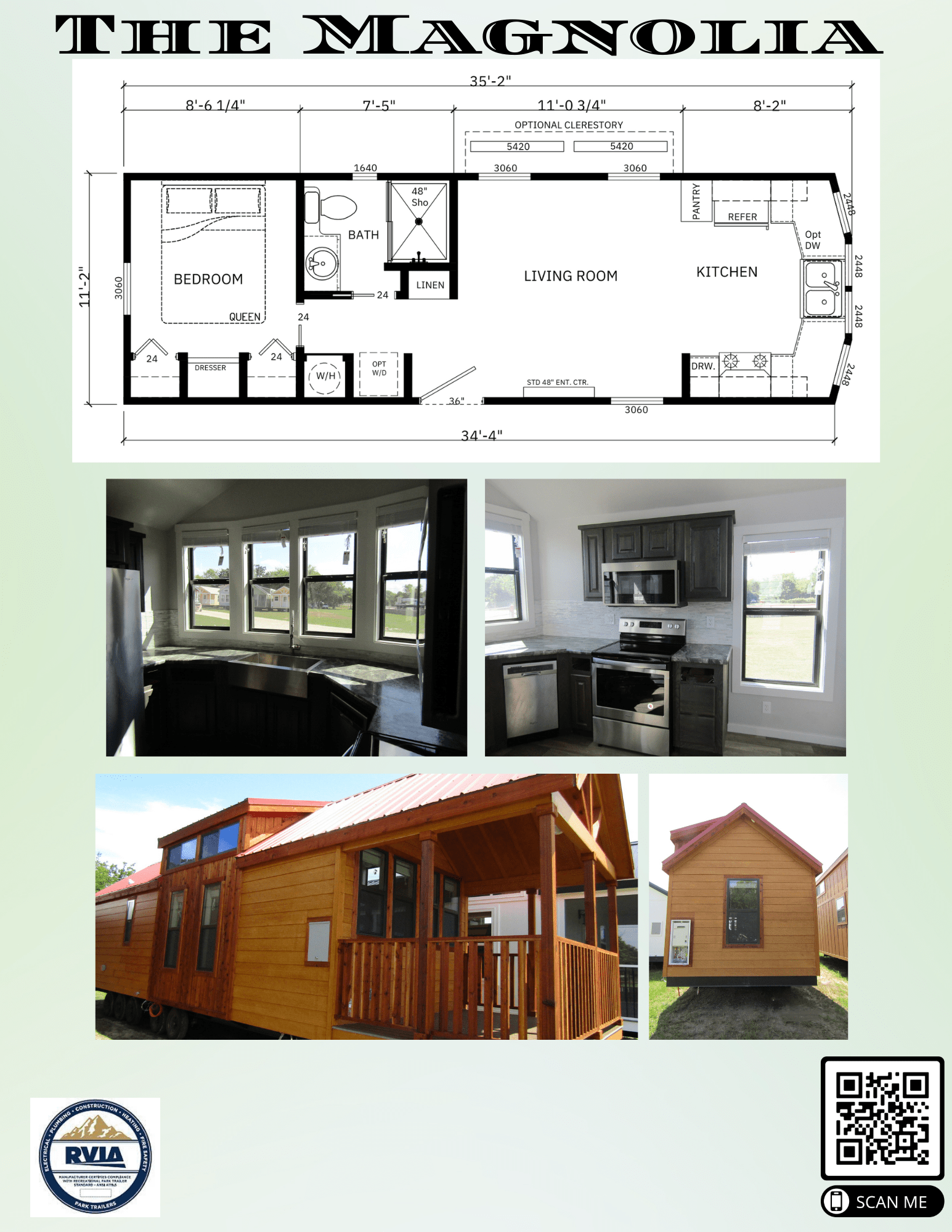The Magnolia Park Model Tiny Home from Utah Structures combines elegance, efficiency, and durability in a beautifully designed space. Featuring a front U-shaped kitchen with custom real wood cabinetry, soft-close doors and drawers, and black appliances, including an 18 cu. ft. refrigerator, 30″ smooth-top electric range, and microwave, it offers both style and functionality. Built to last, it boasts 40-year Tuff-Rib metal roofing, 30-year Hardie Cempanel siding, heavy-duty roof trusses, and hurricane tie-down strapping. Energy-efficient dual-pane Low-E windows, LED can lights, and a radiant barrier roof decking ensure comfort year-round. Additional highlights include a 48″ entertainment center, bay window front, Moen fixtures throughout, and tape & textured walls, creating a cozy and modern living space designed for long-term enjoyment.