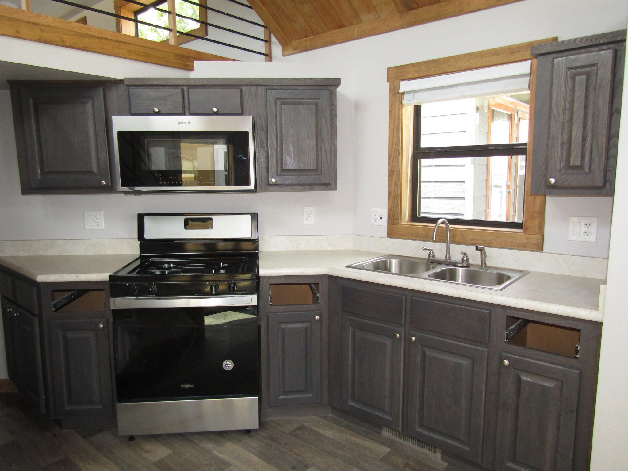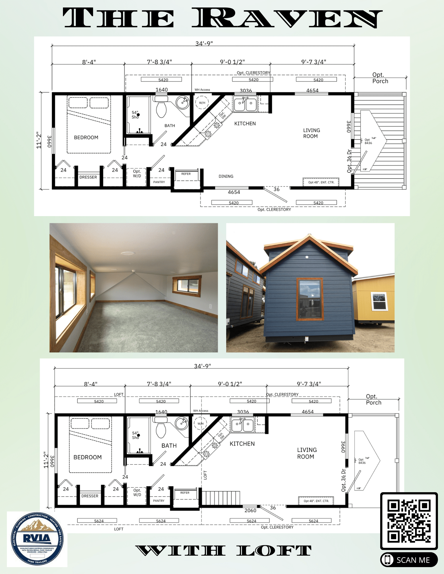 The Raven Park Model Tiny Home from Utah Structures offers a perfect combination of functionality, durability, and style. Featuring a side kitchen with custom real wood cabinetry, a stainless steel sink, and sleek black appliances like an 18 cu. ft. refrigerator, 30″ coil top electric range, and range hood, this model is built for convenience and comfort. Designed with 40-year Tuff-Rib metal roofing and 30-year Hardie Board & Batt siding, the Raven is as durable as it is beautiful. Inside, LED overhead can lights, dual-pane Low-E windows, and SYP interior trim create a bright, welcoming atmosphere. The 54″ one-piece shower, porcelain raised toilet, and 20-gallon electric water heater ensure modern comforts, while features like radiant barrier roof decking, hurricane tie-down strapping, and 100amp service provide lasting quality and safety. With its attention to detail and high-quality construction, the Raven is the perfect tiny home for those seeking both style and durability.
