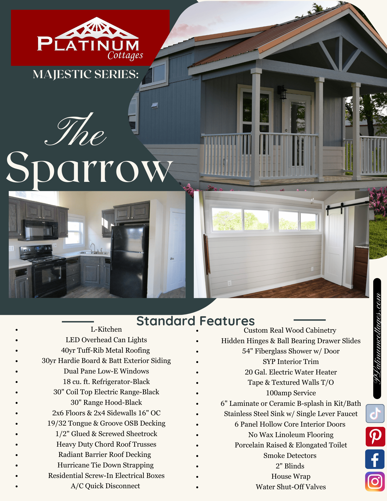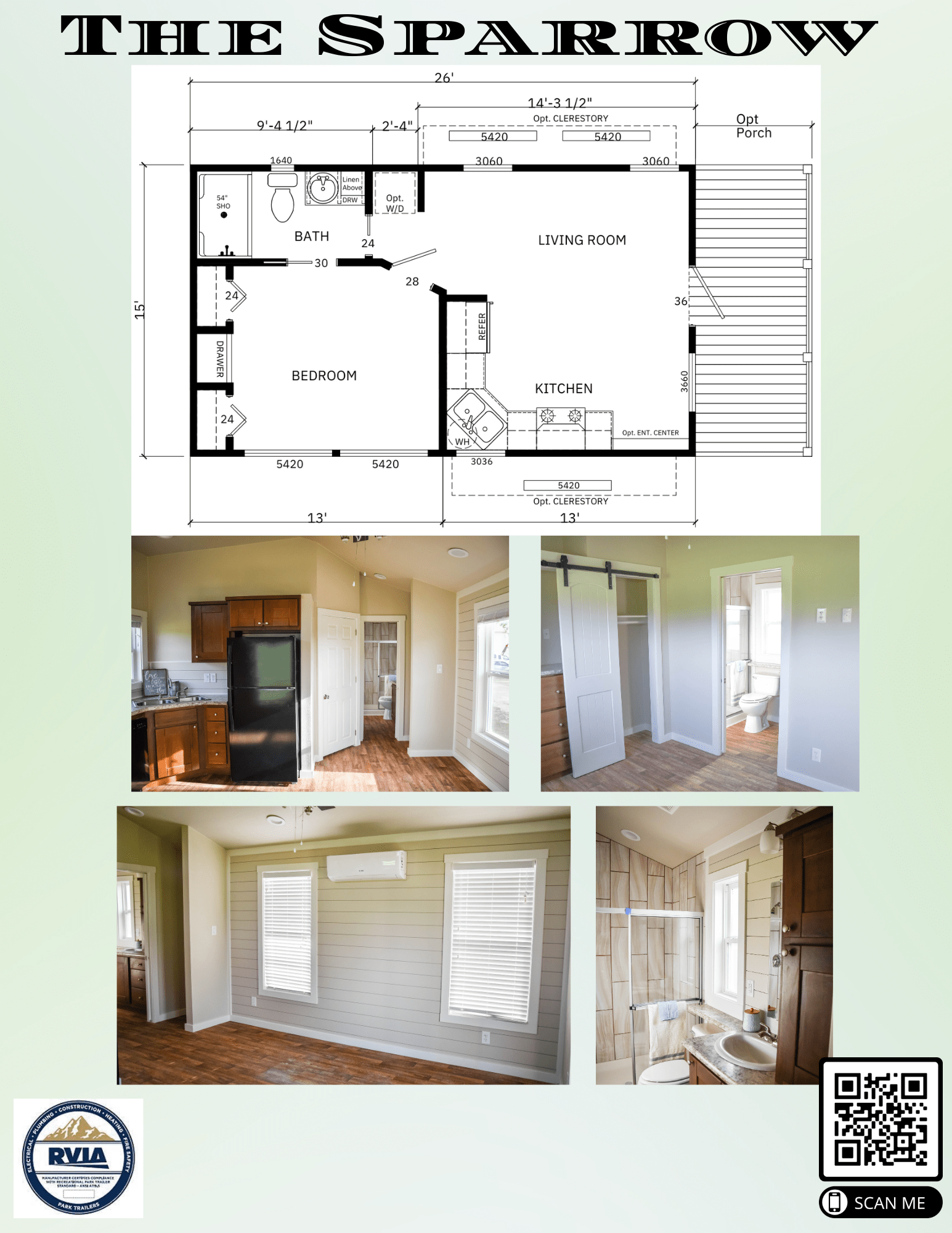 Sleek, modern, and built for both style and durability—the Sparrow Modern Park Tiny Home from Utah Structures is designed to elevate compact living. Its L-shaped kitchen maximizes space and efficiency, featuring custom real wood cabinetry, hidden hinges, and black appliances, including an 18 cu. ft. refrigerator, 30” coil top electric range, and range hood. Natural light pours in through dual-pane Low-E windows, complementing the contemporary feel of tape & textured walls and LED overhead can lights. Built for longevity, the Sparrow boasts 40-year Tuff-Rib metal roofing, 30-year Hardie Board & Batt siding, and heavy-duty chord roof trusses, ensuring resilience in any setting. A 54” fiberglass shower with a door, porcelain raised toilet, and 20-gallon electric water heater bring everyday luxury, while radiant barrier roof decking and hurricane tie-down strapping provide unmatched structural integrity. Whether you’re looking for a full-time residence or a stylish retreat, the Sparrow blends modern design with high-quality craftsmanship to create the perfect tiny home experience.