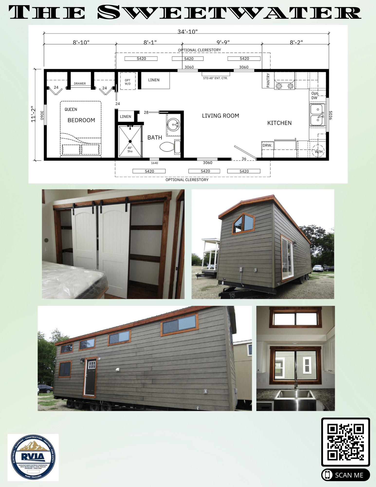 The Sweetwater Park Model Tiny Home from Utah Structures combines modern comfort with lasting durability. Its front U-shaped kitchen features custom real wood cabinetry, soft-close doors, and black appliances, including an 18 cu. ft. refrigerator, smooth top range, and microwave. Bright and inviting, the home includes LED lighting, dual-pane Low-E windows, and a 48” entertainment center. Built to last, it boasts 40-year metal roofing, Hardi Cempanel siding, and heavy-duty roof trusses. A porcelain raised toilet, 20-gallon water heater, and stylish backsplash add convenience. With hurricane tie-downs and radiant barrier roof decking, the Sweetwater is designed for both style and strength.